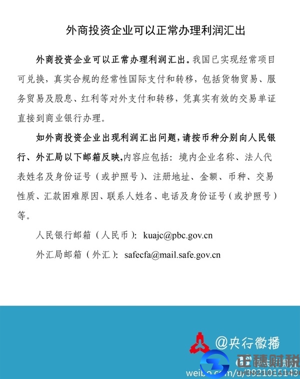 據(jù)廣州外資公司注冊(cè)網(wǎng)了解到,近日網(wǎng)傳外企在華利潤(rùn)無(wú)法匯回。對(duì)此,中國(guó)人民銀行28日在其官方微博發(fā)布公告稱(chēng),我國(guó)已實(shí)現(xiàn)經(jīng)常項(xiàng)目可兌換,真實(shí)合規(guī)的經(jīng)常性國(guó)際支付和轉(zhuǎn)移,包括貨物貿(mào)易、服務(wù)貿(mào)易及股息、紅利等對(duì)外支付和轉(zhuǎn)移,憑真實(shí)有效的交易單證直接到商業(yè)銀行辦理。